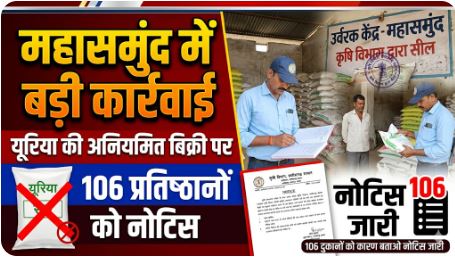 महासमुंद जिले में 16-29 मार्च 2026 के दौरान पीओएस मशीन के माध्यम से यूरिया के अनियमित वितरण के मामलों में 106 प्रतिष्ठानों को कारण बताओ नोटिस जारी। 86 निजी और 20 सहकारी संस्थाओं को 7 दिन में जवाब देने को कहा गया।