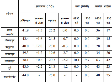 तापमान की बात करें तो प्रदेश में सबसे अधिक तापमान राजनांदगांव में 44°C दर्ज किया गया, जबकि अंबिकापुर में न्यूनतम तापमान 19.6°C रहा। रायपुर और महासमुंद जैसे जिलों में भी तापमान 43 से 44 डिग्री के आसपास पहुंचने का अनुमान है, जिससे गर्मी का असर और अधिक महसूस किया जा रहा है।