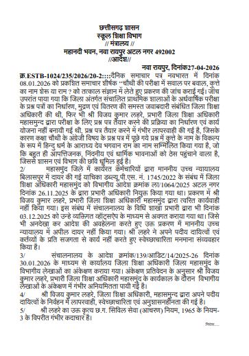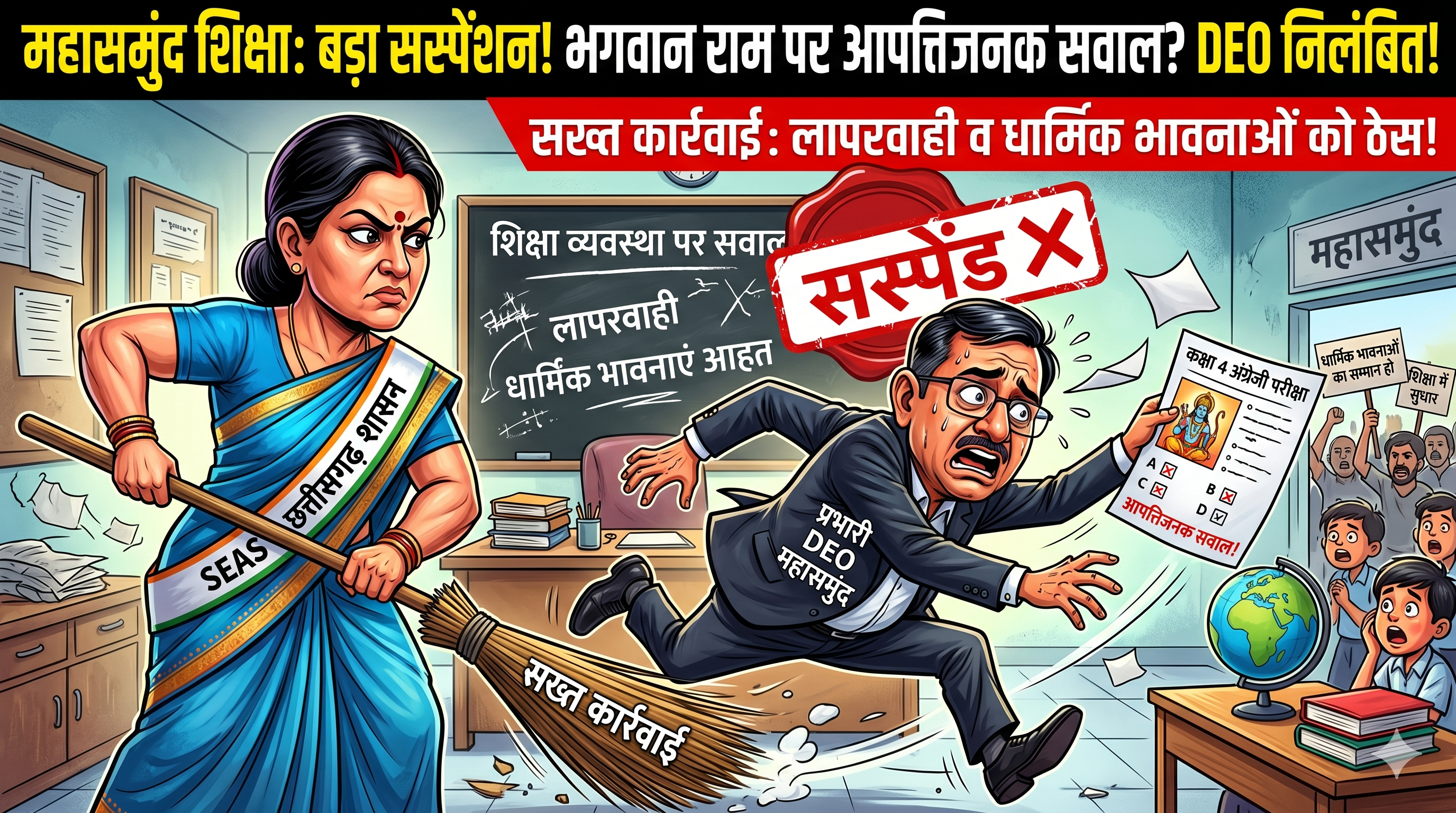 महासमुंद की शिक्षा व्यवस्था पर बड़ा सवाल खड़ा करते हुए छत्तीसगढ़ शासन ने सख्त कार्रवाई की है। प्रभारी जिला शिक्षा अधिकारी विजय कुमार लहरे को तत्काल प्रभाव से निलंबित कर दिया गया है। यह कार्रवाई सिर्फ एक गलती की नहीं, बल्कि लापरवाही, अनुशासनहीनता और संवेदनशील मुद्दों को नजरअंदाज करने की पूरी श्रृंखला का नतीजा है। सबसे बड़ा विवाद उस समय सामने आया जब कक्षा चौथी की अंग्रेजी परीक्षा में एक सवाल के विकल्प में भगवान राम का नाम शामिल कर दिया गया। यह मामला जैसे ही सार्वजनिक हुआ, इसे धार्मिक भावनाओं को ठेस पहुंचाने वाला और बेहद आपत्तिजनक माना गया।
