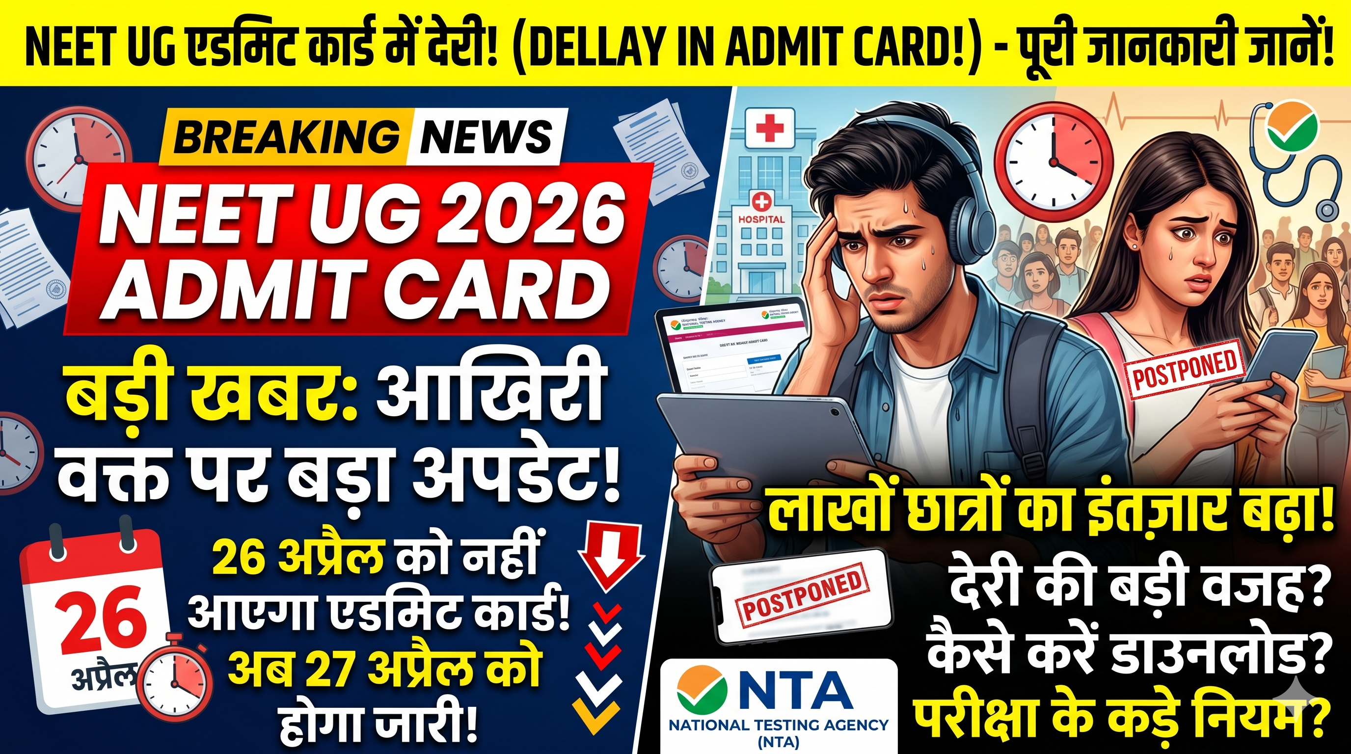 देश की सबसे बड़ी मेडिकल प्रवेश परीक्षा NEET UG 2026 को लेकर लाखों छात्रों का इंतजार अब और बढ़ गया है। National Testing Agency (NTA) ने आखिरी वक्त पर बड़ा अपडेट देते हुए एडमिट कार्ड जारी करने की तारीख टाल दी है। पहले 26 अप्रैल को आने वाला हॉल टिकट अब 27 अप्रैल को जारी होगा—वो भी तय समय के साथ। ऐसे में सवाल यह है कि आखिर देरी की वजह क्या है, एडमिट कार्ड कब और कैसे मिलेगा, और परीक्षा से पहले किन जरूरी नियमों का पालन करना अनिवार्य है? पूरी जानकारी जानना हर अभ्यर्थी के लिए बेहद जरूरी है।